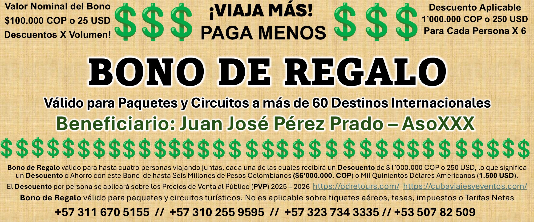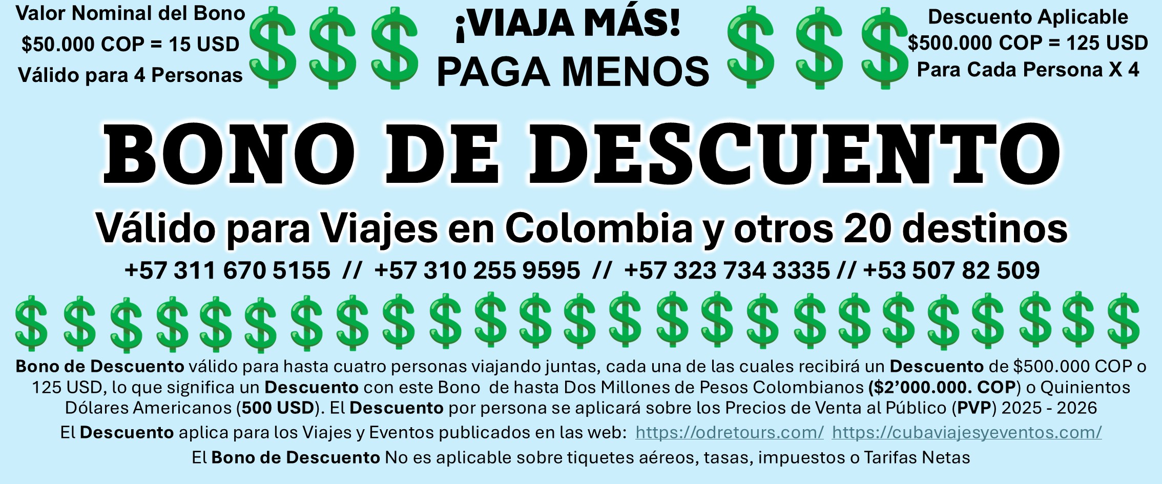 Además, si eres Persona Jurídica y te interesa adquirir una cantidad igual o superior a veinte (20) de estos exclentes Bonos de Descuento para Viajes y Eventos en Cuba, por favor escríbenos a nuestros correos: gerencia@odretours.com, cubaviajesyeventos@gmail.com, o llama a nuestras líneas directas de WhatsApp: +57 311 670 5155 // +57 310 255 9595 +57 323 734 3335 // +53 507 82 509